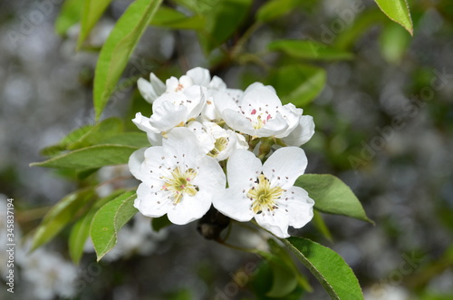 © ket167600, Obraz premium Inflorescence of a blossoming pear tree in sunny weather.