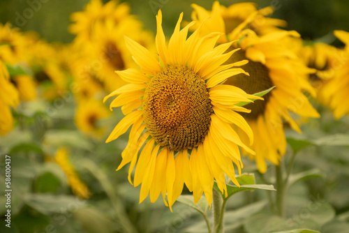 © Gioia, Naklejka premium inflorescence of sunflower with yellow petals in agricultural field close up