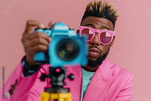 © Mongkol, Obraz premium Influencer man in a pink suit creating content in a studio setting, ideal for vlogging and blogging on social media.