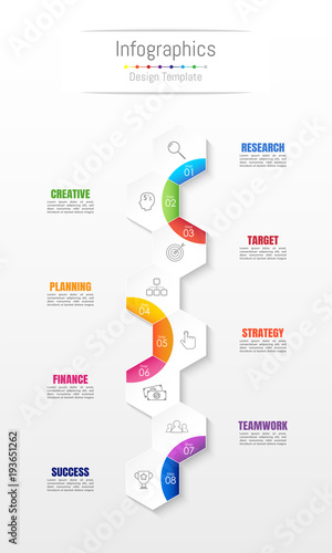 Naklejka premium Infographic design elements for your business data with 8 options, parts, steps, timelines or processes. Vector Illustration.