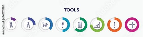 Obraz premium infographic element with tools outline icons. included forceps, big pliers, wheelbarrow full, drill tip, rectangles, digging, leather cutter, wheelbrace vector.