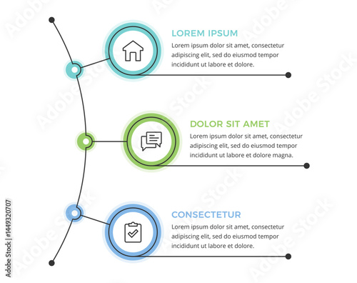 © PixMarket, Naklejka premium Infographic template with three circular options connected by a line, suitable for business presentations, workflow steps, data visualization, vector eps10 illustration