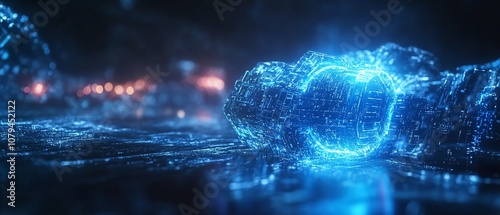 Fototapeta premium Information confidentiality and cyber data protection, 3D rendering of blue padlock, glowing geometric shapes, dark abstract background, hightech visuals