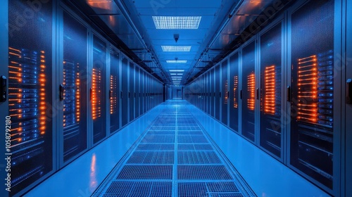 Fototapeta premium information flowing through a data center, illuminated in shades of blue and orange, showcasing racks of high-tech hardware and a futuristic cloud computing environment, emphasizing the digital age