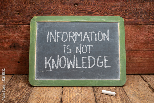 © MarekPhotoDesign.com, Fototapeta premium information is not knowledge quote - white chalk text on a vintage slate blackboard against rustic wood, education, science and communication concept