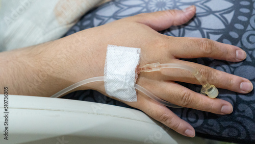 © ArikEkaSatya, Fototapeta premium Infusion tube attached to the hand. Infusion plaster on hand with isolated focus.