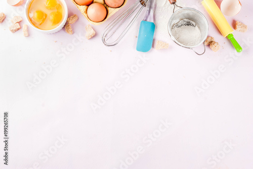 Fototapeta premium Ingredients and utensils for cooking baking egg, flour, sugar, whisk, rolling...