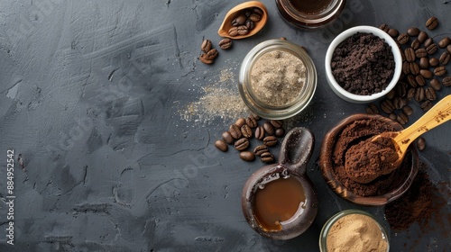 © DigitalDruid, Fototapeta premium Ingredients for creating eco friendly coffee skin scrub with space for text displayed on a gray background