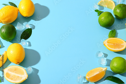 Fototapeta premium Ingredients for preparing lemonade on blue background