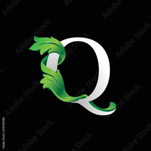 © ariefpro, Fototapeta premium Initial letter Q, 3D luxury green leaf overlapping white serif font on black background