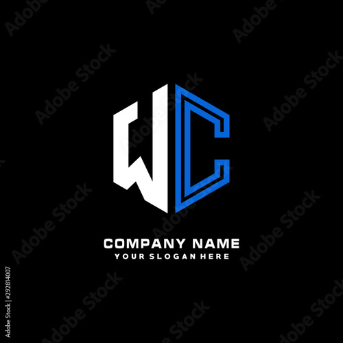 Obraz premium Initial letter WC minimalist line art hexagon shape logo. color blue,white,black background