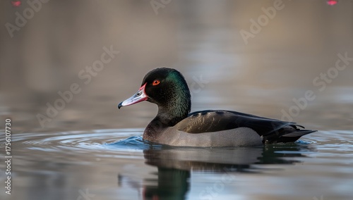 Obraz premium Initial Winter Appearance of a Cuffed Diving Duck on a River with Natural Scenery