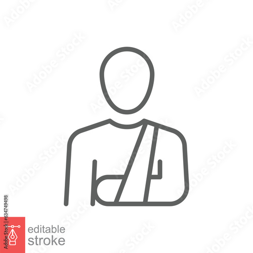 © Skydot, Obraz premium Injured man in bandage icon. Simple outline style. Broken arm, patient, person, wound, medical concept. Thin line symbol. Vector illustration isolated on white background. Editable stroke EPS 10.