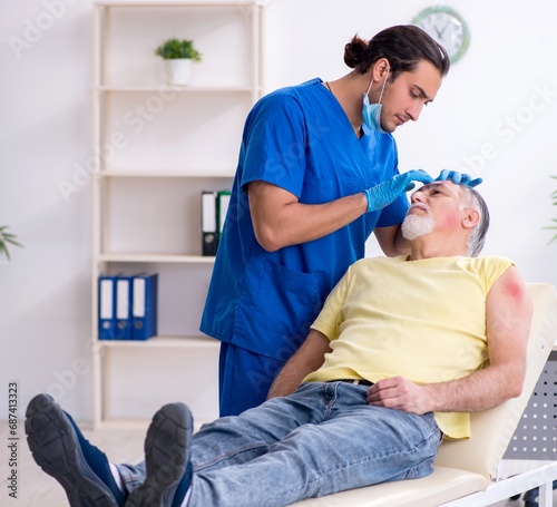 Fototapeta premium Injured old man visiting young male doctor traumatologist