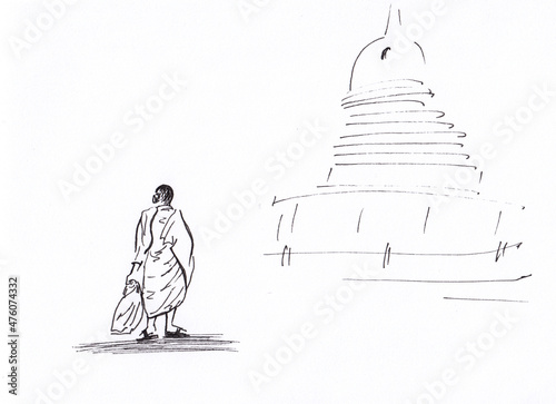 © Valeriya, Naklejka premium Ink pen peaceful minimalist drawing of walking Buddhist monk in face mask and distant temple. Asian landscape illustration. Use for print, card, poster, book illustration, meditation background.