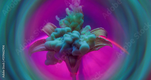 © golubovy, Fototapeta premium Ink vapor. Flower smoke. Art fluid spill on fresh lily natural petals. Haze multicolor dye blend on neon purple gleam circle background.