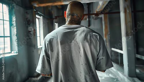 © annebel146, Naklejka premium Inmate with tattoos in beige uniform in jail cell, Male prisoner serves imprisonment term for crime in prison. Detention center or correctional facility.