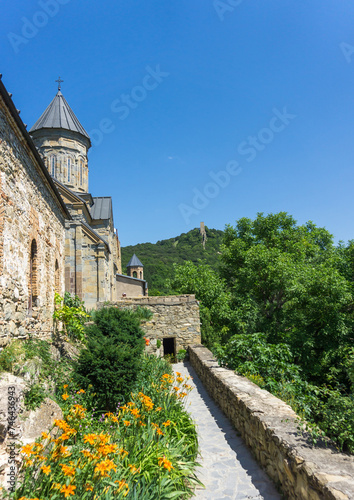 © Michael, Fototapeta premium Inner courtyard of the monastery. Stone wall and dome of church, trees and flowers. Tower on the hill.