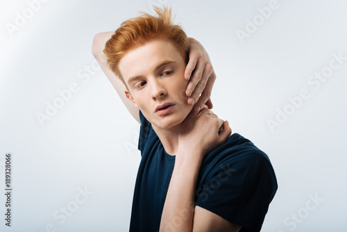 Fototapeta premium Innocent look. Appealing cute nice guy placing hands on the neck and looking...