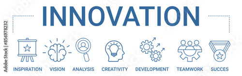 © Luckyicons, Obraz premium Innovation concept banner icon contain of inspiration, vision, analysis, creativity, development, teamwork, and success vector illustration