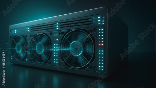Fototapeta premium Innovation's Cool Pulse: A cutting-edge, digital device's sleek design in the shadows, highlighted by vibrant turquoise light.