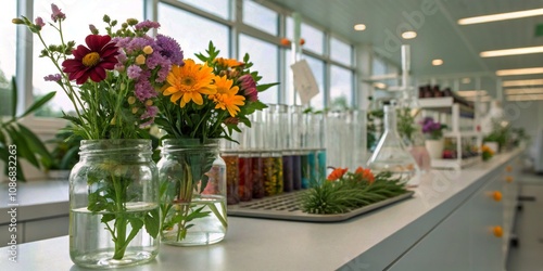 Fototapeta premium Innovative Botanical Experiments in a Modern Laboratory with Sunlit Glass Jars Showcasing Vibrant Flowers for Research and Development in Plant Biology and Horticulture
