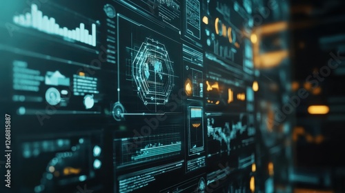 © vadosloginov, Obraz premium Innovative display showcasing fintech platforms and data analytics in a modern tech environment