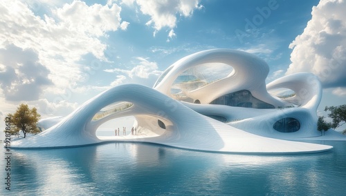 Obraz premium Innovative Organic Architecture with Fluid Forms and Reflective Waters Under...