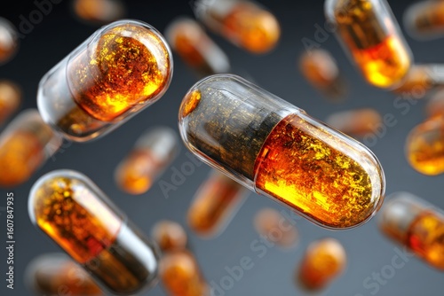 © R, Fototapeta premium Innovative therapies visualized as floating capsules. Biological research. Reducing overtreatment in crohn's: insights from a groundbreaking study. Biological markers. Treatment pathways.