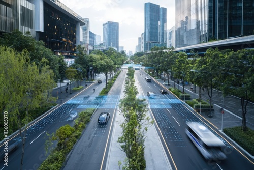 © Nakorn, Obraz premium Innovative urban design smart technology interactive displays and autonomous vehicles in city environments