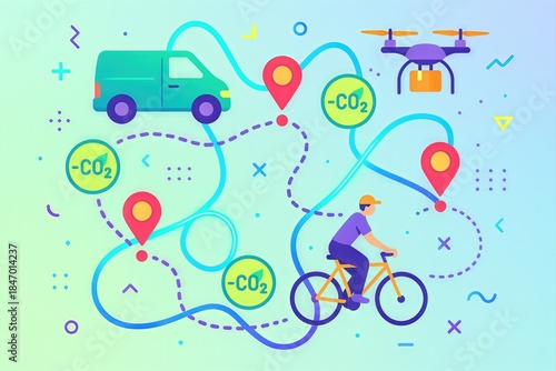 Fototapeta premium Innovative Urban Mobility Solutions Featuring Electric Delivery Van and Bicycle Commuter Demonstrating CO2 Reduction Strategy with Interactive GPS Mapping and Drone Logistics Framework