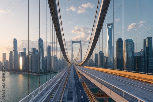 © Michael, Fototapeta premium Innovative Urban Suspension Bridge Engineering in a Technology-Driven Skyline