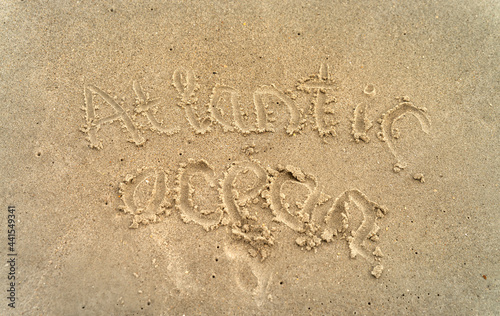 Fototapeta premium Inscription "Atlantic ocean" on a yellow sand