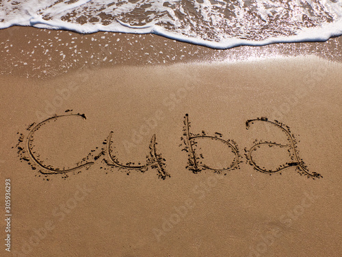 Fototapeta premium Inscription Cuba on the sandy beach and foamy sea water
