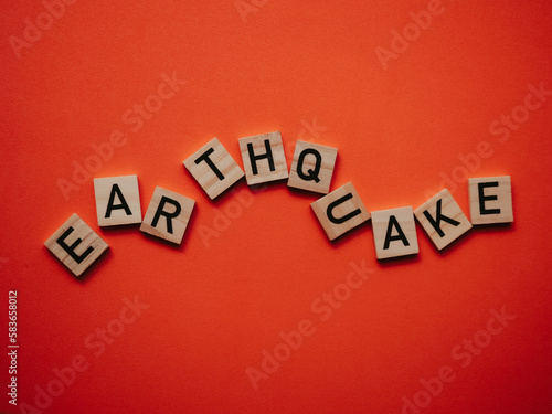 © klevo, Obraz premium Inscription earthquake from vibration moves on background. Concept of earthquake, destruction and shifts of earth's crust. Wooden square blocks with letters are laid out on orange sheet. Slow motion
