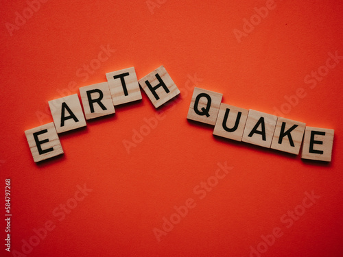 © klevo, Obraz premium Inscription earthquake from vibration moves on background. Concept of earthquake, destruction and shifts of earth's crust. Wooden square blocks with letters are laid out on orange sheet. Slow motion