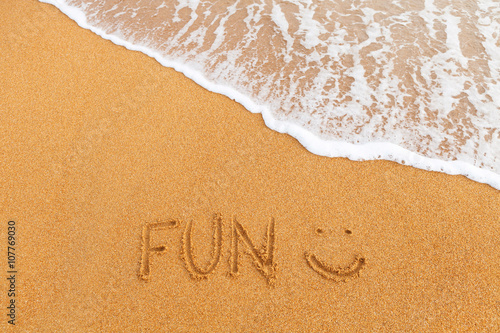© lukszczepanski, Fototapeta premium Inscription "FUN" made on the beach by the blue sea