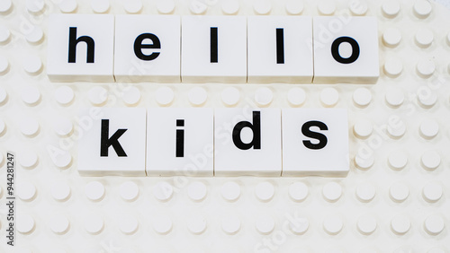 © Andy Shell, Obraz premium Inscription: Hello children. Mosaic board for learning English. Tutorial