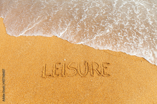 © lukszczepanski, Fototapeta premium Inscription "LEISURE" made on the beach by the blue sea