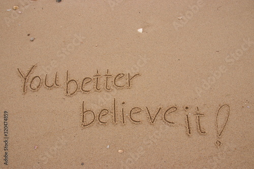 Fototapeta premium inscription on the sand, Handwriting words "You better believe it?" on sand...