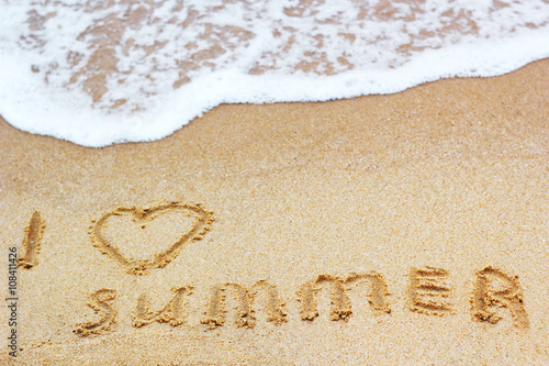 © verona_studio, Fototapeta premium Inscription on wet sand I Love Summer. Concept photo of summer vacation.