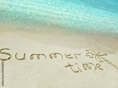 © BRIAN_KINNEY, Fototapeta premium Inscription "Summer" in the sand on a tropical island, Maldives