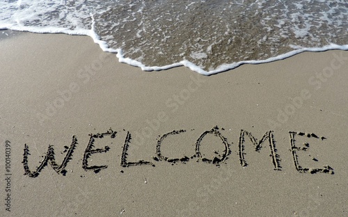 © anastasiiam, Fototapeta premium Inscription Welcome on wet sand.