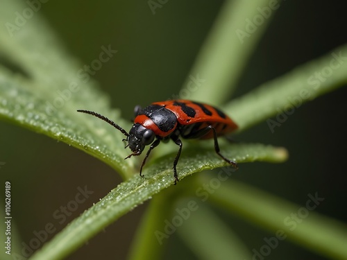 Fototapeta premium Insect feeding on a green plant, close-up of a red and black bug.