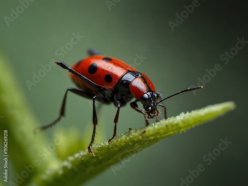 © claudunia, Naklejka premium Insect feeding on a green plant, close-up of a red and black bug.
