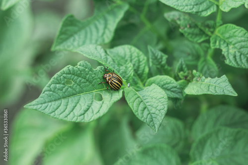 Fototapeta premium Insect pest Colorado potato beetle sits on a potato bush