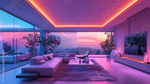© Achirawee, Fototapeta premium Inside a futuristic smart home, various devices are seamlessly integrated into the AI management system, with augmented reality interfaces displaying real-time data. The room features a minimal color