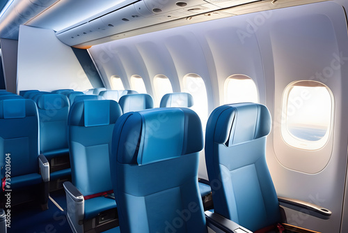 © D, Fototapeta premium Inside an Airplane With Blue Seats