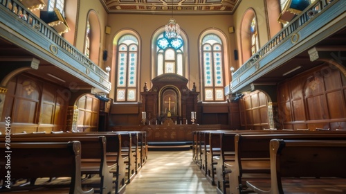 © Andrii, Obraz premium Inside of a Church With Pews and Stained Glass Windows