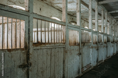 Fototapeta premium Inside old wooden stable or barn with horse boxes, corridor